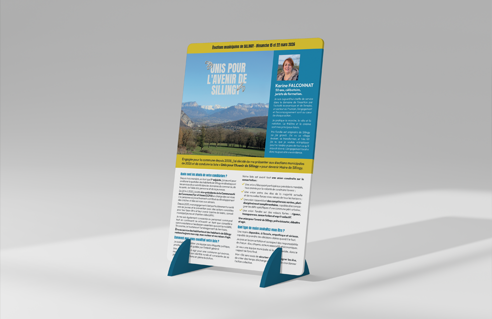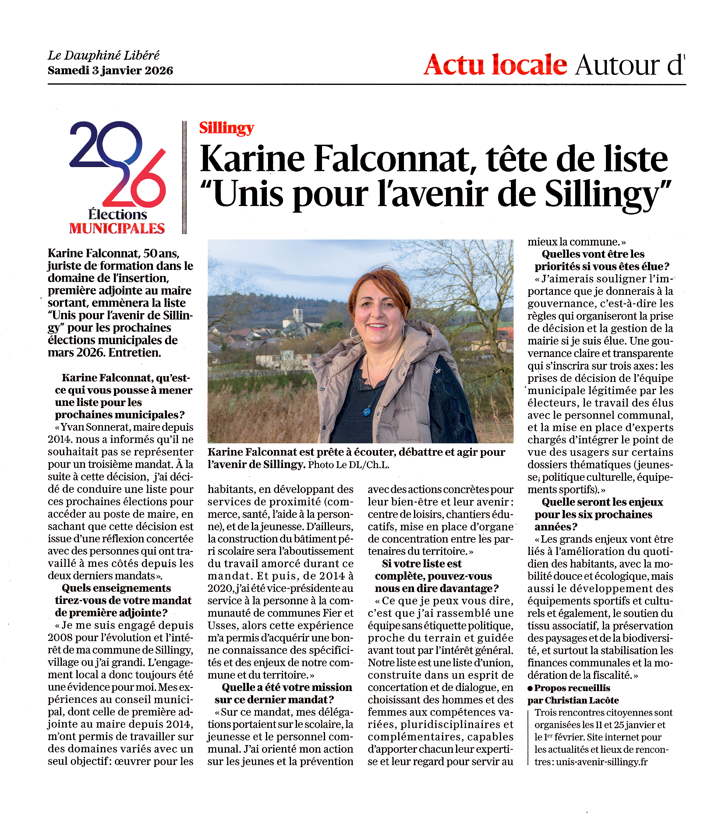 « Unis pour l’Avenir de Sillingy » est une liste citoyenne composée d’habitants de tous horizons, rassemblés autour d’un projet commun : œuvrer pour notre commune dans le respect, l’écoute et l’intérêt général. Nous croyons en une démocratie locale vivante, participative et transparente. Notre ambition est claire : construire une commune durable, solidaire et dynamique, en mettant les habitants au cœur des décisions. Portée par Karine Falconnat, notre liste défend une vision pragmatique, humaine et tournée vers l’avenir.