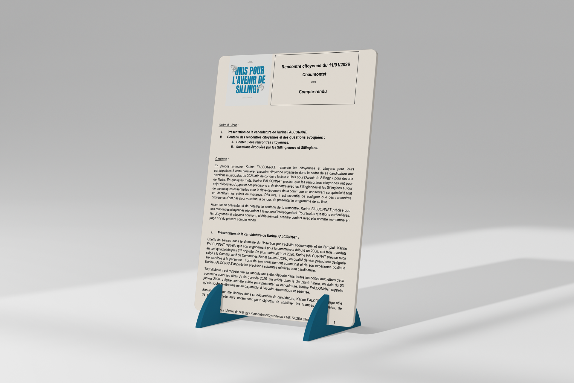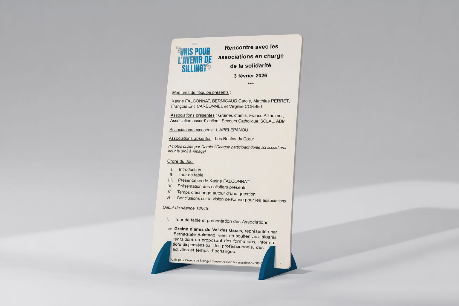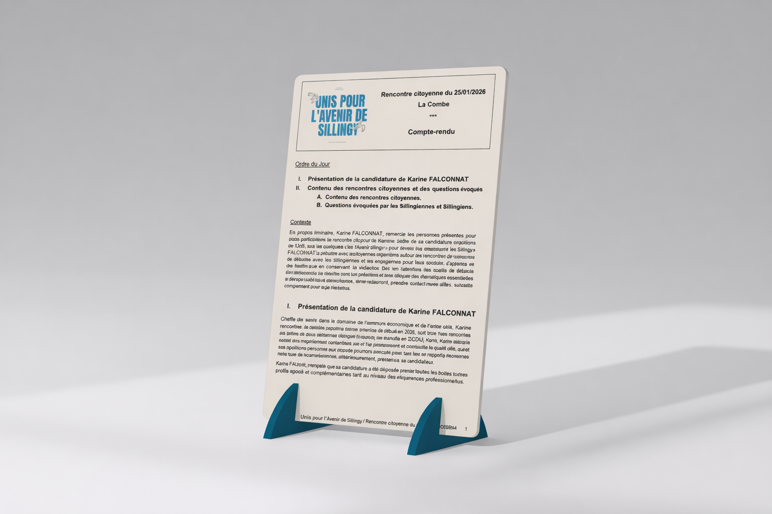 Notre démarche est transparente, participative et ancrée dans le quotidien. Chaque décision que nous prenons s’appuie sur l’écoute, le dialogue et le bon sens. Nous pensons que la politique locale doit être avant tout une affaire de proximité, d’efficacité et d’humanité. Autour de Karine Falconnat, nous porterons un programme réaliste et responsable, centré sur vos priorités pour Sillingy. Rejoignez-nous pour transformer ensemble nos idées en actions concrètes.